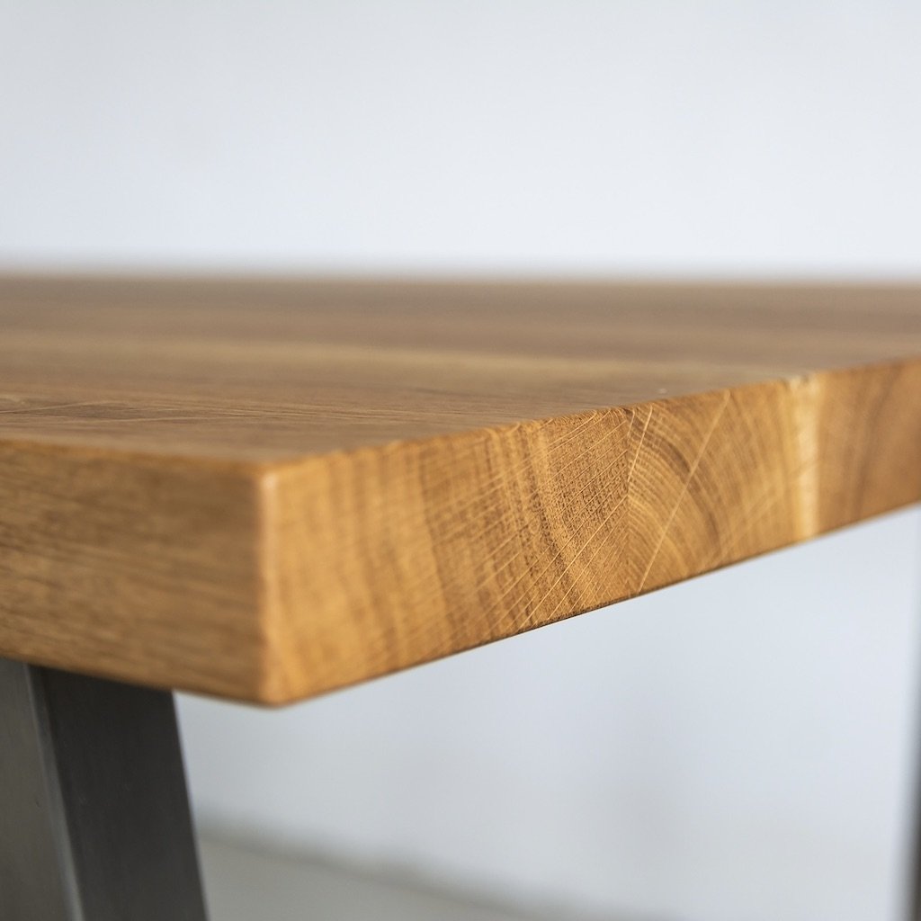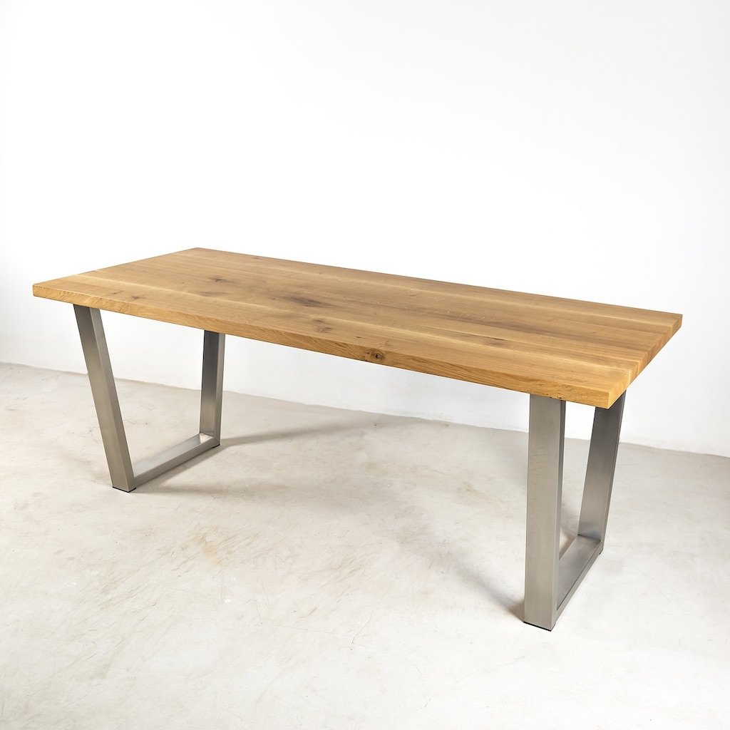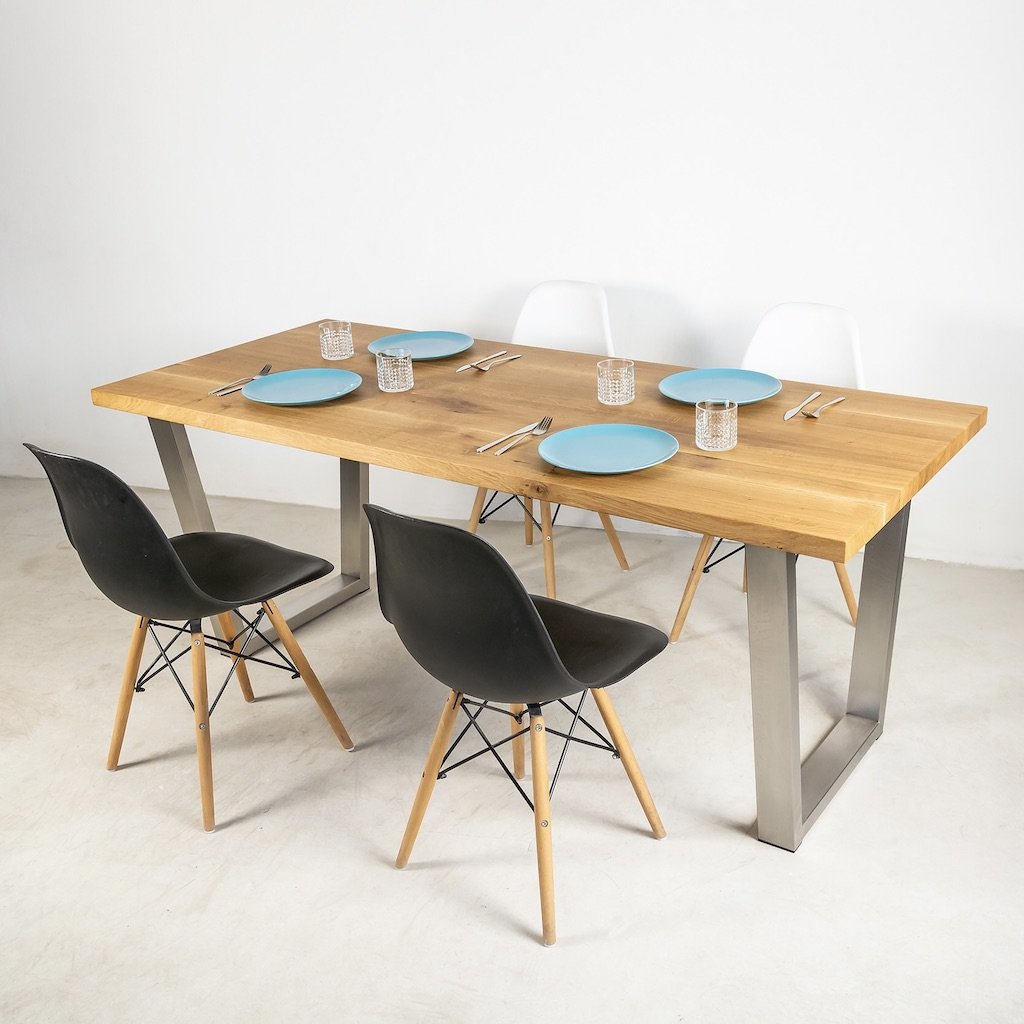 Masivní jídelní stůl z dubového dřeva a broušeného nerezu