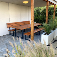 Dubový stůl a dvě lavice už dorazili na svoje místo pod pergolu.