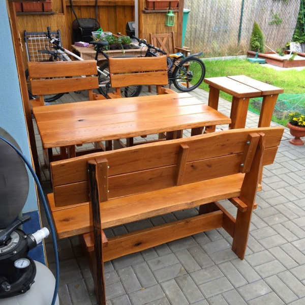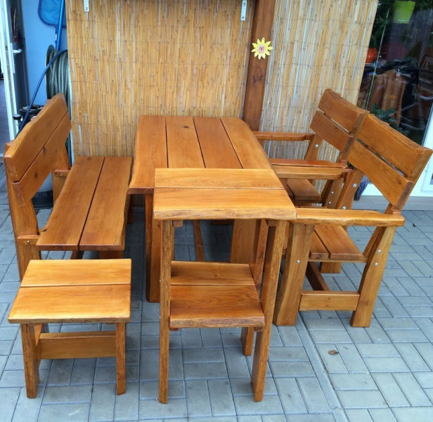 Povrch zahradního nábytku je ošetřen silnovrstvou lazurou odstín ořech.
